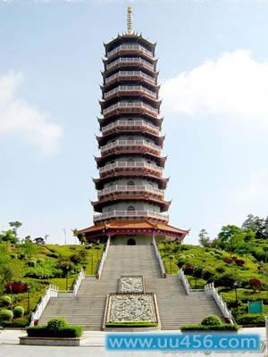 龙光塔位于江门市区南郊被誉为侨都“市肺”的白水带风景区最高点的牛头山上。塔为11层仿宋琉璃瓦塔,塔总高79米