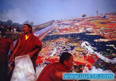 每年拉萨雪顿节期间,哲蚌寺要举行隆重的展佛仪式。藏历六月三十日为“哲蚌雪顿”。这天,哲蚌寺的僧人们要在根培乌孜山上挂出一副高三十米、宽二十米的巨大释迦牟尼像供人们瞻仰。高高在上的大佛笼罩在薄雾轻纱间,任人千呼万唤就是不露尊贵的容颜,唯有等天光出现,第一抹朝霞染红东边天际的时候,那佛的印纱才徐徐地升起。这是一副用彩缎镶成的美丽无比的大佛,朝晖相映更显光彩夺目。巨幅高挂,香烟袅袅,赞美之声如浪涛拍案,洁白的哈达似雪莲飘飞,人们涌向大佛、涌向神圣。佛体上数不清的哈达堆积成了绵延的雪浪。这是一个激动人心的美好时刻,信徒们争相以最虔诚的方式表示对佛的顶礼膜拜,山道上游人香客仍络绎不绝。这是一副绚丽多姿的图画,这是一种难以用语言表达的激动,这是一种永远的回味无穷。