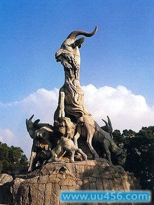 五羊石像坐落越秀公园内,该石像有一美丽传说:五位仙人身着五色衣服,骑五色羊,从南海飘来,降临广州,五只羊嘴里各衔一茎六穗的稻谷。仙人将稻穗送给当地居民,并祝福永无饥荒,言毕腾空而去,羊化为石。广州亦得别称“羊城”和“穗城”。