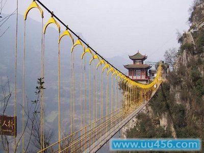 三、过情人桥:一座灵巧轻盈的钢索桥将两座如情侣般遥相呼应的凤凰亭紧紧的连在一起,桥下是万丈深壑,高山峡谷,走在桥上,犹如漫步在云端,心情时而放松,时而绷紧,其乐无穷。