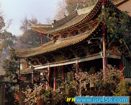 距春城昆明41公里的安宁葱山中支,林木苍翠,绿草如茵,群峰屏列,云气蒸腾。崖谷之间,清泉琮铮,鸟叫蝉鸣。半山腰里,有一座颇享盛名的丛林古刹———曹溪寺。