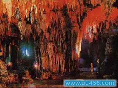 离梳妆台不远,是白骨精的死对头孙悟空的地盘。拍《西游记》时的'花果山福地,水帘洞洞天'石刻完好无损。这里奇花异木、间见廊柱,如同海底龙宫,可见美猴王花果山风景不凡,齐天大圣选中这么块'洞天福地'做山大王,目光不俗。可惜水帘洞已撤,倒是离它不远处有一挂水帘,但见瀑流飞泻,宽约十米,气热恢宏,给人'黄河之水天上来'的竟境。倘再加点音响效果,谁也不会怀疑这是凝固成型的钟乳石。