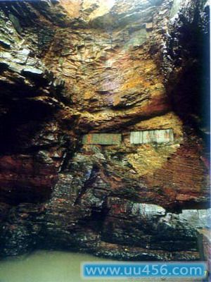 洞口有一棵千年古藤,藤皮虽已剥茗,但枝叶青葱,生机勃勃,覆盖洞顶...