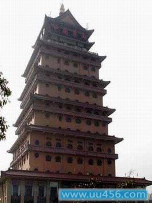 塔顶还有四尊金光闪闪的塑像,分别代表“福禄寿喜”,塑像旁的说明饶有趣味。财神像上面写道:“市场经济的今天树立财神像,为的是让大家树立正确的金钱观,公正公平合理合法管理好家庭、企业和国家的财政。”