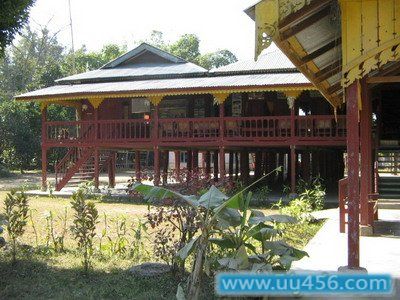 瑞丽大等喊位于瑞丽市南20多公里,“大等喊”是“大金水塘”或“大金湖”之意。据说很早以前这里还是瑞丽江的江道,由于地势稍高形成了一个大旋涡,后江水改道,逐渐形成了一个村庄。大等喊种满了柚子树、凤尾竹、董棕等。在万绿丛中,是一座座干栏式的傣家竹楼,构成了一幅美妙的天然画卷,被誉为“农村天然公园”,是瑞丽农村最大、最优美的寨子之一。密林深处有一清乾隆年间修建的奘寺,传说系佛祖传经布道路过此地住了一夜,信徒为纪念他而建的。奘寺是典型的傣式建筑,三层歇山顶重檐楼台,左右是两间重檐顶亭阁,穿斗走栏与亭阁相连,俨然是一座傣族古代宫殿。《孔雀公主》等电影都到此取景,人们便把这里戏称为《孔雀王宫》。