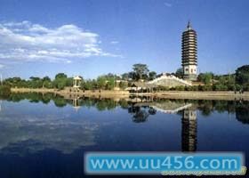 一条百米彩色长廊横跨南北两湖之间,长廊长98米,宽2.5米,钢筋水泥结构,廊上分别绘制了61幅<<西游记>>和66幅<<红楼梦>>故事图。第根枋梁上绘制了山水花鸟图,画面色采鲜艳,造型生动。