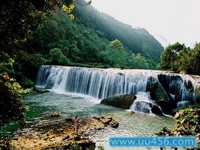 九龙河瀑布群景区位于县城东北20公里处,4公里长的河床密布着钙化滩、叠水和瀑布,最大的九龙第一瀑高56米,宽112米,蔚为壮观。
