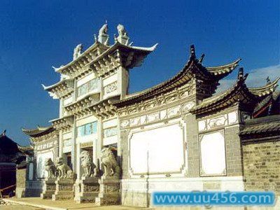 木府门前的石牌坊,用采自下虎跳金沙江边的汉白玉建成,宽9米,高约18米,4根石柱撑着牌坊上的碑、椽、檐和坊盖,匾额上镌刻着明神宗钦赐的“忠义”二字。 这座结构宏伟、雕刻精湛的石雕建筑远近闻名,民间有“大理三塔寺,丽江石牌坊”的说法,可惜在文化大革命的十年浩劫中被拆除。