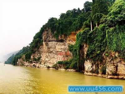 夔门,又名瞿塘关。两岸高山凌江夹峙,是长江从四川盆地进入三峡的大门。夔门两侧的高山,南名“白盐山”,北曰“赤甲山”,拔地而起,高耸入云。近江两岸则壁立如削,恰似天造地设的大门。白盐山系因粘附在岩石上的水溶液,主要含钙 质,色似白盐而得名;赤甲山因含有氧化铁的水溶液粘附在风化的岩层表面,此山土石呈红色,如人袒背,故名赤甲山。隔江相望,一个红装,一个素裹,可谓奇景。两座山都是石灰岩,长期的风剥雨蚀,使两岸岩壁好似刀削斧砍一般,形成十分秀丽的片段景观。面江迎风之绝壁陡岩,虽然寸草难生,而各现异彩,这些色调和晨曦、晚霞、明月交相辉映,形成了“赤甲晴晖”、“白盐曙色”和“夔门秋月”等胜景。杜甫有诗咏那赤白两山:赤甲白盐俱刺天,闾阎缭绕接山巅。枫林桔树丹青见,复道重楼锦锈悬。这里河宽只有百余米,把滔滔大江紧束得象一条沟壑,而通过的流量往往多达每秒五、六万立方米。“众水会涪万,瞿塘争一门”,杜甫用一“争”字,活画出夔门的赫赫水势。当轮船驶出瞿塘峡西口后,您走到船尾,抬眼望去,全景式的夔门雄姿便展现在您的面前。这时是摄影留念的最佳角度。现在,临江的石壁上,还刻有孙元良的“夔门天下雄,舰机轻轻过。”十个行书大字,李端浩的篆刻“巍哉夔门”和行书“夔门·瞿塘”均历历在目。