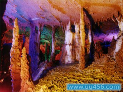 还有一池仙女们沐浴用的圣水,传说凡人用之沐浴能健身美容、返老还童。不知哪位愿意下水一试?不管如何,在这天池中洗洗手总是有益无害的,曾经有人在此洗手后,麻将、扑克桌上总是抓好牌。龙宫仙河乘船进入龙宫的码头,人们称之为“逍遥津渡”。在还没上船之前,可先看看龙宫的面貌,其实这是一条地下暗河。可以看到,那蜿蜒幽长的河道,在七彩灯光的辉映和奇岩异石的装点下,多像天上的银河,因此,此景叫“龙宫仙河”。