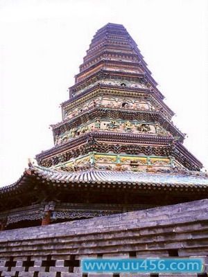 飞虹塔位于大山西洪洞县城东北17公里广胜上寺。塔身琉璃镶嵌,俗称琉璃塔。始建于汉,屡经重修,现存为明嘉靖六年(1527年)重建,天启二年(1622年)底层增建围廊塔平面八角形,十三级,高47.31米。