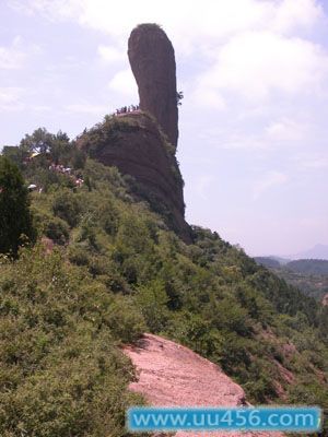 清康熙四十一年(1702年)康熙皇帝以该峰状似磬锤,将此山赐名为“磬锤峰”。磬锤峰孤立于平缓的山峦之上,犹柱擎天,那上部略粗下部略细的自然造型很容易开启人的想象力,说它可与纳米比亚的“上帝的姆指”相媲美,说它状若磬锤、棒槌,都是印在文字上的文雅表述,在当地人的心中它更象采天地之精华的阳具,那些不会生育的妇女踩着虔诚的步履(虽有缆车也不能坐),就为了到峰顶摸一摸它,感觉一下它的阳刚气息。或许真有妇人因此而得螟蛉之子,否则这种近乎于宗教仪式的习俗就不会沿袭至今了。