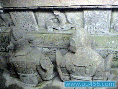在棺床东西雕刻着由10种打击乐器组成的鼓乐队;在西面雕刻着由10种吹奏乐器组成的管乐队;南面雕刻的是两个乐队领队人,弹弄着琵琶和柏板。整个石刻乐队,场面壮观,是研究唐文化不可多得的实物资料,后室放置御床,正面有双龙戏  珠浮雕,左右是狮兽浮雕。床上则是王建的坐像,神态肃穆。整个建筑气魄雄伟,装饰华丽精美。