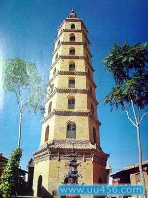距平罗县城20公里的田州塔,俗称姚伏塔,矗立在姚伏镇东一公里外的柳荫丛中。塔呈平面六角形,八层楼阁式砖塔,高38米,塔顶呈六边覆斗状,塔底直径为7.5米,南北各有一门,门墙上有对联,对联书法隽秀有力,对仗工整。
