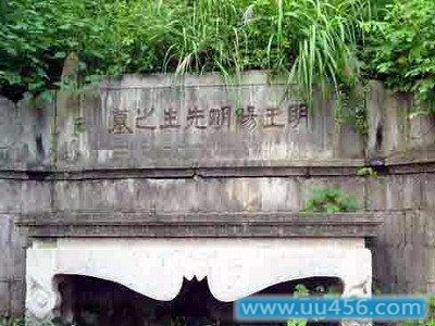 王阳明墓位于书法圣地兰亭以南两里许的鲜虾山麓。由墓道、平台、墓穴、墓碑、祭桌等组成,座北朝南,背依山岗,顺依山势,逐级升高,视野开阔,风水特佳。自甬道至墓顶全长80米,宽30米,用花岗石砌筑,规模按照原样,垂带、纹饰一如古制。碑文“明王阳明先生之墓”八个大字,系著名书法家沈定庵题书。中设青石平台,便于远眺凭吊,墓旁有合抱古松数十棵,增添肃穆气氛,墓身左右林木葱茏,四季常青。