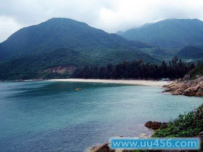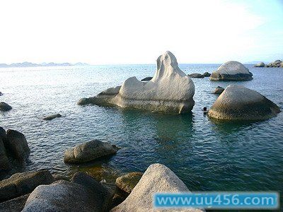 无论是来自哪里的游客,当乘坐的旅游车渐渐驶进红海湾海滨浴场,都会感到眼前骤然一亮——阳光下,那一片沙滩呈淡淡的金黄色,微微闪着光,碧蓝的大海与碧蓝的天空水天相连。其间点缀着几丛黑礁石,粼粼的浪花轻轻擦过,偶尔溅起几点洁白的浪花。长长的海滩潇洒地舒展开来,延伸出去,被大海拉出一道优美的圆弧线条,透出一种沉静之美。