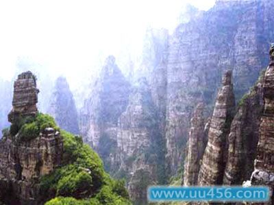 其中的“双峰对峙”是指有两个独立的石峰并排冲天而起。靠东南侧的叫独秀峰,亦称“公白石”高耸四削,徐霞客在《游记》中形容它“独秀四削为天柱,非傅轮(插上羽翼)不能翔上”;靠南面的叫莲芯峰,亦称“母白石”,比“公白石”略低,徐霞客说它“三面亦危崖特立,惟南面开罅梯隙得挤”。环列在这两座山峰周围的5座山叫五娃峰。山上有“白石洞天”四个1丈见方的大字。前人有诗赞道: