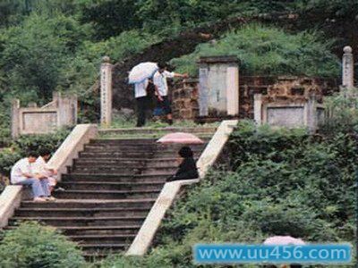 辛弃疾墓座落在铅山县瓜山之后的虎头门阳原山腰之中,离县城二十四公里,座北面南,左右双峰,如拱似抱.当地人为纪念辛弃疾,称此山为稼轩山。