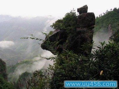 山高坡陡, 云雾缭绕,时隐时现,恰似仙岛。峰顶插剑岩跑马坪等仙迹留踪,江南少见的大型风电场,颇为壮观。山间有全省最高水电站谷溪岙,一级电站车口溪。
