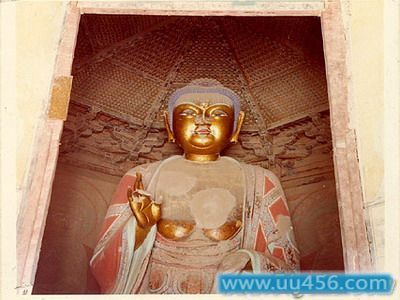 走进第一层塔的南门,迎面便是高约10米的释迦塑像。顶部有精美华丽的藻井。内槽的墙壁上,画有六幅如来佛像,门洞两侧的墙壁上,也绘有金刚、天王、弟子等壁画。壁画中最引人注目的是内槽门额壁板上的三个女供养人。画面虽不大,但人物的体态匀称,面容丰满,神情安详而虔诚,衣带似被微风吹动,在表态中给人以动的感觉。画面的色彩至今仍很鲜艳,可能是后人在辽画的基础上重新描饰的。