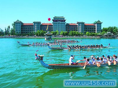 池畔建有式样各异的“启明”、“南辉”、“长庚”及“左”、“右”、“逢”、“源”七个亭子。端午节举办龙舟赛,这里金鼓齐鸣,波光色影,人声沸腾。外地和本地的健儿驾着七彩龙舟,劈波斩浪,奋勇争先。岸上喝彩,水上声嘶,竞渡场面,十分热烈。