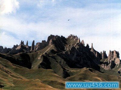 奎克乌苏石林,因位于天山山脉西段、那拉提山北麓的奎克乌苏达坂之下而得名,石林区海拔3500米,长9公里,宽5公里,相对高度30米。石林似林非林,它是由半胶洁的砂砾岩层经外营力的长期雕塑,变得千姿百态,光怪陆离,石林中有“欧州古堡”,肃穆森严,有“宝剑出鞘”,刺破青天,有“行人走兽”,或卧或躺。