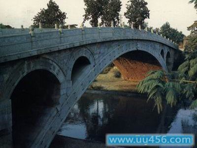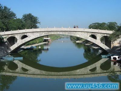 赵州桥又名安济桥,俗称大石桥。位于石家庄东南约四十多公里的赵县,横跨皎河之上,建于隋代大业元年至十一年(605-616),是工匠李春设计建造的,距今已有1400年,不仅是我国,而且是世界上现存最早、保存最好的巨大石拱桥,被誉为“华北四宝之一”。赵州桥是一座弧型单孔石拱桥,全长64.4米,单孔跨度为37米多,桥面宽约十米,用厚约三十厘米的条石铺成,在桥两端的石拱桥上,各辟两个券洞,这种桥梁的结构形式叫“敞肩拱”,是世界土木工程桥梁史上的首创。赵州桥被列为中国重点文物保护单位之一。
