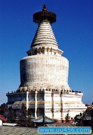 元世祖忽必烈崇信佛法,迎释迦佛舍利,至元八年(1271)在大都城西南修建了这座大型喇嘛塔。至元十六年(1279)建成后,又在塔前建了一座规模宏大的寺院,救名"大圣寿万安寺"。寺院殿堂栏楯一如内廷,佛像 窗壁皆饰金,是元朝皇室在大都兴建的重要工程之一。1368年全部殿堂被雷火焚毁,仅白塔幸免。明宣德八年修复,改称妙应寺。清康熙、乾隆间又几经修葺,现仅白塔为元代遗物。寺由四层殿堂和塔院组成。院中间耸立着白塔,四周各建小角亭一座。白塔由塔基、塔身和塔刹3部分组成。台基高9米,塔高50.9米,底座面积1422平 方米,台基分三层,最下层呈方形,台前有一通道,前设台阶,可直登塔基,上、中二层是亚字形的须弥座。台基上砌基座,将塔身、基座连接在一起。莲座上又有5条环带,承托塔身。塔身俗称"宝瓶",形似覆钵,上安7条铁箍,其上又有亚字形小型须弥座,再上就是13天相轮,顶端为一直径9.7米的华盖,华盖以厚木作底,上置铜板瓦并做 成40条放射形的筒脊,华盖四周悬挂着36副铜质透雕的流苏和风铃,微风吹动,铃声悦耳。华盖中心处,还有一座高约5米的鎏金宝顶,以8条粗壮的铁链将宝顶固定在铜盘之上。
