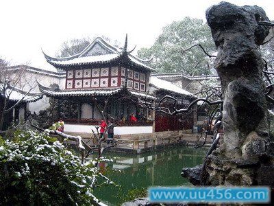 冠云峰:鸳鸯厅北院,矗产着著名的留园三峰:冠云峰、瑞云峰、袖云峰。冠云峰雄峙居中,瑞云峰、帕云峰屏立左右。相传为宋代“花石纲”遗物。当年在采运过程中,曾落入太湖,捞取后移来园中。其中冠云峰高6.5米,重约5吨,清秀挺拔,兼具“皱、透、漏、瘦”的特点,有江南园林峰石之冠的美誉。 佳晴喜雨快雪之亭,在冠云峰、鸳鸯厅之西,长廊三面环绕,自成一座小院。亭中有楠木屏门六扇,雕刻多种走兽花果,技艺精湛。此亭名称亦很别致,此园四时景物,不论晴雨都好,故名。