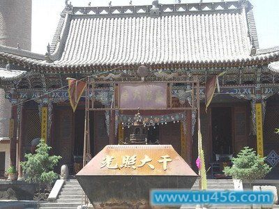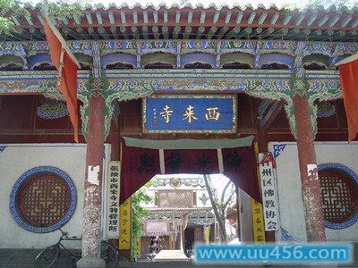 西来寺位于乐都县城东关。始建于明万历三十四年(1606年)。寺坐北面南,由山门、过厅、东西两厢和大殿组成。山门面宽3间,进深1间,中为门廊,东西两旁分设泥塑四大金刚;过厅和东西两厢,为木作结构,内供观音、土地神。大殿面宽5间,进深3间,单檐歇山顶,矗立在台基上,雄伟壮观。大殿周檐斗栱繁缛,昂嘴下突,具有明代建筑的典型风格。大殿内原有泥塑圆雕的三世佛,中间是释迦牟尼,两边是文殊和普贤,还有阿难、迦叶、比丘等。东西两山墙上八大供养菩萨,端坐在莲花须弥座上,神态安详,栩栩如生。墙面上浮雕的山水、人物、建筑等,小巧玲珑。