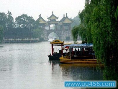 冶春园位于园饭店侧畔,南面沿湖,北倚丘阜。此地以水取胜,临湖筑有草庐水榭,一半在岸上,一半伸入湖中,冶春