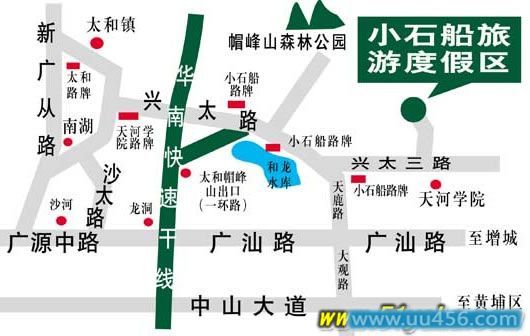 自驾车:小石船自驾车从1)广汕路转天鹿路;2)广从路转一环路;3)华南快速干线(北行)到太和(帽峰山)出口,然后再转兴太三路,就可见到小石船风景区的路标,再走几分钟就到达景区。
