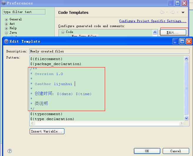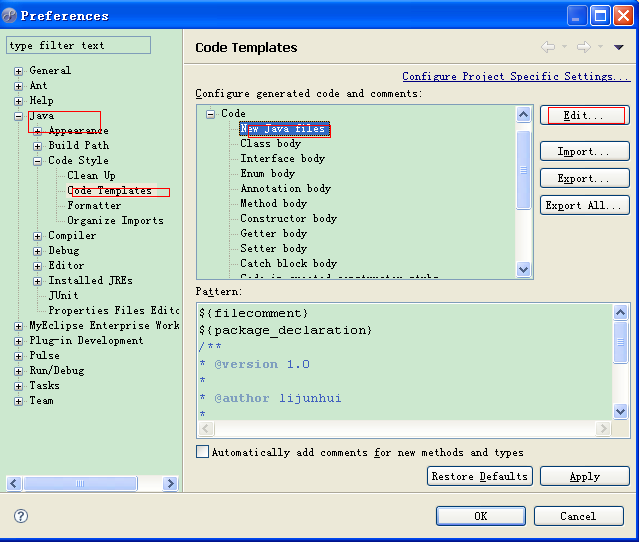 Eclipse自动添加文件注释windows--preference Java--Code Style--Code Templates code--new Java file
