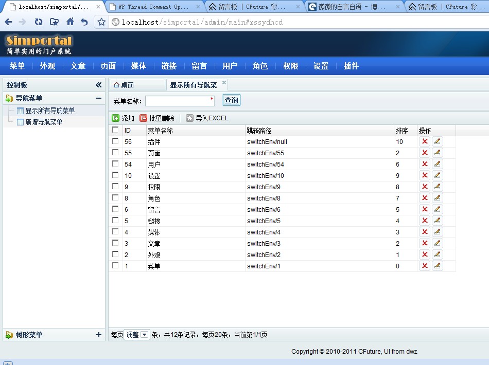 截止到2011年8月17日晚上20点,EWeb4j已经更新至1.b.6.x版本了,这是一个里程碑版本,值得庆贺。目前提供了下载,包括源代码,jar包,javadoc 另外,一个值得高兴的消息是,我使用DWZ最新版本作为后台界面,eweb4j1.b.6.4版本开发了一个简单的门户系统雏形,目前整个系统已经搭建起来了,但功能只实现了部分,包括用户登陆,注册,查看,登陆验证,菜单管理(DWZ后台界面的菜单自定义)。现在先发上来,包括源代码都有,大家可以参考来学习EWeb4j。有任何问题可以联系: