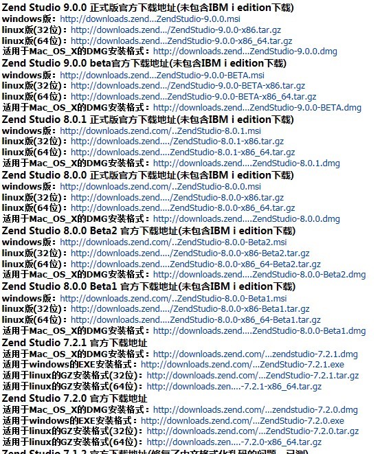 zendstudio所有版本下载 下载目录:http://www.zendstudio.net/zend-studio-all-in-one-download/快速下载:http://downloads.zend.com/studio-eclipse/9.0.0/ZendStudio-9.0.0.msi