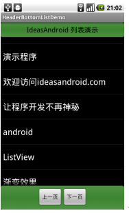 <?xml version="1.0" encoding="utf-8"?><RelativeLayoutxmlns:android="http://schemas.android.com/apk/res/android"android:orientation="vertical"android:layout_width="fill_parent"android:layout_height="fill_parent"><RelativeLayoutandroid:id="@+id/listHeader"android:background="@drawable/jbshape"android:layout_alignParentTop="true"android:gravity="center_horizontal"android:layout_width="fill_parent"android:layout_height="wrap_content"><TextViewandroid:text="IdeasAndroid 列表演示"android:textColor="#000000"android:textSize="18dip"android:layout_width="wrap_content"android:layout_height="wrap_content" /></RelativeLayout><RelativeLayoutandroid:id="@+id/listFooter"android:background="@drawable/jbshape"android:gravity="center_horizontal"android:layout_alignParentBottom="true"android:layout_width="fill_parent"android:layout_height="wrap_content"><Buttonandroid:id="@+id/prePage"android:layout_width="wrap_content"android:layout_height="wrap_content"android:text="上一页" android:layout_alignParentLeft="true" /><Buttonandroid:layout_width="wrap_content"android:layout_gravity="right"android:layout_height="wrap_content"android:text="下一页"android:layout_toRightOf="@id/prePage" /></RelativeLayout><ListViewandroid:id="@+id/myListView"android:layout_width="fill_parent"android:layout_height="fill_parent"android:layout_below="@id/listHeader"android:layout_above="@id/listFooter" /></RelativeLayout>