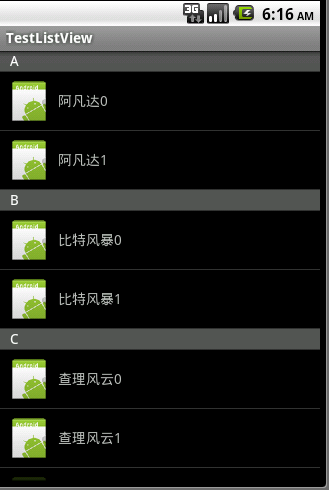 package com.magus.list;import java.util.ArrayList;import java.util.List;import android.app.Activity;import android.content.Context;import android.os.Bundle;import android.view.LayoutInflater;import android.view.View;import android.view.ViewGroup;import android.widget.ArrayAdapter;import android.widget.ListView;import android.widget.TextView;public class MainActivity extends Activity {private GroupListAdapter adapter = null;private ListView listView = null;private List<String> list = new ArrayList<String>();private List<String> listTag = new ArrayList<String>();@Overrideprotected void onCreate(Bundle savedInstanceState) {super.onCreate(savedInstanceState);setContentView(R.layout.group_list_activity);setData();adapter = new GroupListAdapter(this, list, listTag);listView = (ListView) findViewById(R.id.group_list);listView.setAdapter(adapter);}public void setData() {list.add("A");listTag.add("A");for (int i = 0; i < 2; i++) {list.add("阿凡达" + i);}list.add("B");listTag.add("B");for (int i = 0; i < 2; i++) {list.add("比特风暴" + i);}list.add("C");listTag.add("C");for (int i = 0; i < 30; i++) {list.add("查理风云" + i);}}private static class GroupListAdapter extends ArrayAdapter<String> {private List<String> listTag = null;public GroupListAdapter(Context context, List<String> objects,List<String> tags) {super(context, 0, objects);this.listTag = tags;}@Overridepublic boolean isEnabled(int position) {if (listTag.contains(getItem(position))) {return false;}return super.isEnabled(position);}public View getView(int position, View convertView, ViewGroup parent) {View view = convertView;if (listTag.contains(getItem(position))) {view = LayoutInflater.from(getContext()).inflate(R.layout.group_list_item_tag, null);} else {view = LayoutInflater.from(getContext()).inflate(R.layout.group_list_item, null);}//getItem(position) 得到的是list里面String,String str = getItem(position);System.out.println("getItem(position)="+str);TextView textView = (TextView) view.findViewById(R.id.group_list_item_text);textView.setText(getItem(position));return view;}}}