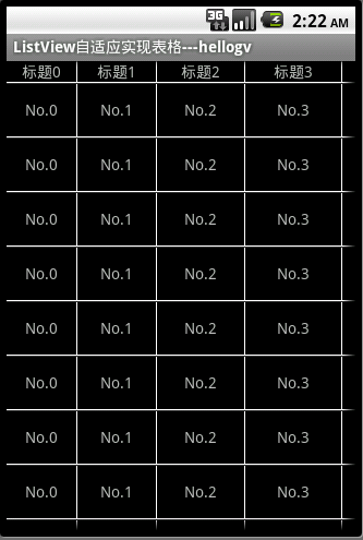 package com.magus.listview; import java.util.List; import android.content.Context; import android.graphics.Color; import android.view.Gravity; import android.view.View; import android.view.ViewGroup; import android.widget.BaseAdapter; import android.widget.ImageView; import android.widget.LinearLayout; import android.widget.TextView; public class TableAdapter extends BaseAdapter { private Context context; private List<TableRow> table; public TableAdapter(Context context, List<TableRow> table) { this.context = context; this.table = table; } @Override public int getCount() { return table.size(); } @Override public long getItemId(int position) { return position; } public TableRow getItem(int position) { return table.get(position); } public View getView(int position, View convertView, ViewGroup parent) { TableRow tableRow = table.get(position); return new TableRowView(this.context, tableRow); } /** * TableRowView 实现表格行的样式 * @author hellogv */ class TableRowView extends LinearLayout { public TableRowView(Context context, TableRow tableRow) { super(context); this.setOrientation(LinearLayout.HORIZONTAL); for (int i = 0; i < tableRow.getSize(); i++) {//逐个格单元添加到行 TableCell tableCell = tableRow.getCellValue(i); LinearLayout.LayoutParams layoutParams = new LinearLayout.LayoutParams( tableCell.width, tableCell.height);//按照格单元指定的大小设置空间 layoutParams.setMargins(0, 0, 1, 1);//预留空隙制造边框 if (tableCell.type == TableCell.STRING) {//如果格单元是文本内容 TextView textCell = new TextView(context); textCell.setLines(1); textCell.setGravity(Gravity.CENTER); textCell.setBackgroundColor(Color.BLACK);//背景黑色 textCell.setText(String.valueOf(tableCell.value)); addView(textCell, layoutParams); } else if (tableCell.type == TableCell.IMAGE) {//如果格单元是图像内容 ImageView imgCell = new ImageView(context); imgCell.setBackgroundColor(Color.BLACK);//背景黑色 imgCell.setImageResource((Integer) tableCell.value); addView(imgCell, layoutParams); } } this.setBackgroundColor(Color.WHITE);//背景白色,利用空隙来实现边框 } } /** * TableRow 实现表格的行 * @author hellogv */ static public class TableRow { private TableCell[] cell; public TableRow(TableCell[] cell) { this.cell = cell; } public int getSize() { return cell.length; } public TableCell getCellValue(int index) { if (index >= cell.length) return null; return cell[index]; } } /** * TableCell 实现表格的格单元 * @author hellogv */ static public class TableCell { static public final int STRING = 0; static public final int IMAGE = 1; public Object value; public int width; public int height; private int type; public TableCell(Object value, int width, int height, int type) { this.value = value; this.width = width; this.height = height; this.type = type; } } } package com.magus.listview; import java.util.ArrayList; import com.magus.listview.TableAdapter.TableCell;import com.magus.listview.TableAdapter.TableRow;import android.app.Activity; import android.os.Bundle; import android.view.View; import android.widget.AdapterView; import android.widget.ListView; import android.widget.LinearLayout.LayoutParams; import android.widget.Toast; /** * @author hellogv */ public class testMyListView extends Activity { /** Called when the activity is first created. */ ListView lv; @Override public void onCreate(Bundle savedInstanceState) { super.onCreate(savedInstanceState); setContentView(R.layout.main); this.setTitle("ListView自适应实现表格---hellogv"); lv = (ListView) this.findViewById(R.id.ListView01); ArrayList<TableRow> table = new ArrayList<TableRow>(); TableCell[] titles = new TableCell[5];// 每行5个单元 int width = this.getWindowManager().getDefaultDisplay().getWidth()/titles.length; // 定义标题 for (int i = 0; i < titles.length; i++) { titles[i] = new TableCell("标题" + String.valueOf(i), width + 8 * i, LayoutParams.FILL_PARENT, TableCell.STRING); } table.add(new TableRow(titles)); // 每行的数据 TableCell[] cells = new TableCell[5];// 每行5个单元 for (int i = 0; i < cells.length - 1; i++) { cells[i] = new TableCell("No." + String.valueOf(i), titles[i].width, LayoutParams.FILL_PARENT, TableCell.STRING); } cells[cells.length - 1] = new TableCell(R.drawable.icon, titles[cells.length - 1].width, LayoutParams.WRAP_CONTENT, TableCell.IMAGE); // 把表格的行添加到表格 for (int i = 0; i < 12; i++) table.add(new TableRow(cells)); TableAdapter tableAdapter = new TableAdapter(this, table); lv.setAdapter(tableAdapter); lv.setOnItemClickListener(new ItemClickEvent()); } class ItemClickEvent implements AdapterView.OnItemClickListener { @Override public void onItemClick(AdapterView<?> arg0, View arg1, int arg2, long arg3) { Toast.makeText(testMyListView.this, "选中第"+String.valueOf(arg2)+"行", 500).show(); } } }