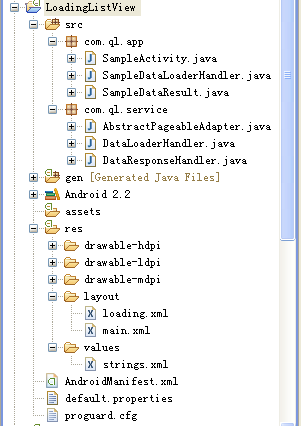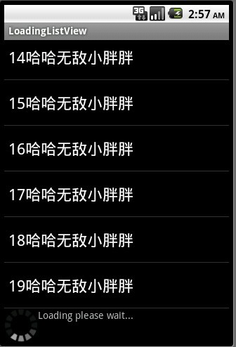 package com.ql.app;/* * Copyright (C) 2010 Makas Tzavellas * * Licensed under the Apache License, Version 2.0 (the "License"); * you may not use this file except in compliance with the License. * You may obtain a copy of the License at * * http://www.apache.org/licenses/LICENSE-2.0 * * Unless required by applicable law or agreed to in writing, software * distributed under the License is distributed on an "AS IS" BASIS, * WITHOUT WARRANTIES OR CONDITIONS OF ANY KIND, either express or implied. * See the License for the specific language governing permissions and * limitations under the License. */import com.ql.service.AbstractPageableAdapter;import com.ql.service.DataLoaderHandler;import android.app.Activity;import android.content.Context;import android.os.Bundle;import android.view.View;import android.view.ViewGroup;import android.widget.ListView;import android.widget.TextView;/** * Sample Activity that contains the Pageable list view. * @author Makas Tzavellas (makas dot tzavellas at gmail dot com) * */public class SampleActivity extends Activity { /** Called when the activity is first created. */ @Override public void onCreate(Bundle savedInstanceState) { super.onCreate(savedInstanceState); setContentView(R.layout.main); ListView listView = (ListView)findViewById(R.id.list); SampleDataLoaderHandler handler = new SampleDataLoaderHandler(); PageableAdapter adapter = new PageableAdapter(listView, this, R.layout.loading, handler); listView.setAdapter(adapter); // Set the adapter as the on scroll listener. // It is done here just incase the activity or other class needs to listen to onScroll event too. listView.setOnScrollListener(adapter); } /** * Sample Pageable adapter that extends {@link AbstractPageableAdapter} * @author Makas Tzavellas (makas dot tzavellas at gmail dot com) * */ private class PageableAdapter extends AbstractPageableAdapter<String> { public PageableAdapter(ListView listView, Context context, int loadingViewResourceId, DataLoaderHandler<String> handler) { super(listView, context, loadingViewResourceId, handler); } public View getView(int position, View convertView, ViewGroup parent) { if (convertView == null) { convertView = getLayoutInflater().inflate(android.R.layout.simple_list_item_1, parent, false); } //((TextView)convertView).setText(getItem(position).toString()); ((TextView)convertView).setText(getItem(position).toString()+"哈哈无敌小胖胖"); return convertView; } }}package com.ql.app;/* * Copyright (C) 2010 Makas Tzavellas * * Licensed under the Apache License, Version 2.0 (the "License"); * you may not use this file except in compliance with the License. * You may obtain a copy of the License at * * http://www.apache.org/licenses/LICENSE-2.0 * * Unless required by applicable law or agreed to in writing, software * distributed under the License is distributed on an "AS IS" BASIS, * WITHOUT WARRANTIES OR CONDITIONS OF ANY KIND, either express or implied. * See the License for the specific language governing permissions and * limitations under the License. */import android.os.AsyncTask;import java.util.ArrayList;import com.ql.service.DataLoaderHandler;import com.ql.service.DataResponseHandler;/** * Sample implementation of the {@link DataLoaderHandler} * @author Makas Tzavellas (makas dot tzavellas at gmail dot com) * */public class SampleDataLoaderHandler implements DataLoaderHandler<String>, DataResponseHandler<SampleDataResult<String>> { private static final int MAX_SIZE_PER_PAGE = 10; private static final int MAX_ITEMS = 51; private boolean mLoading; private ArrayList<String> mValues = new ArrayList<String>(); private DataLoadedCallback<String> mCallback; private int mMaxItems; public int getMaxItems() { return mMaxItems; } public void getNext(DataLoadedCallback<String> callback) { mLoading = true; mCallback = callback; new SampleBackgroundTask(this).execute(mValues.size()); } public void getValues(DataLoadedCallback<String> callback) { if (mValues.isEmpty()) { // No data has been loaded before. // Load the initial data which includes the max size. mLoading = true; mCallback = callback; new SampleFirstBackgroundTask(this).execute(); } else { callback.dataLoaded(mValues); } } public boolean isLoading() { return mLoading; } public void resultAvailable(int status, SampleDataResult<String> result) { mLoading = false; if (mMaxItems == 0) mMaxItems = result.maxItems; mValues.addAll(result.values); mCallback.dataLoaded(result.values); } /** * Sample implementation when loading the data the first time. * @author Makas Tzavellas (makas dot tzavellas at gmail dot com) * */ private static class SampleFirstBackgroundTask extends AsyncTask<Void, Void, SampleDataResult<String>> { private DataResponseHandler<SampleDataResult<String>> mResponseHandler; private SampleFirstBackgroundTask(DataResponseHandler<SampleDataResult<String>> responseHandler) { mResponseHandler = responseHandler; } @Override protected SampleDataResult<String> doInBackground(Void... params) { // Put whatever info ArrayList<String> values = new ArrayList<String>(MAX_SIZE_PER_PAGE); for (int i = 0; i < MAX_SIZE_PER_PAGE; i++) { values.add("" + i); } SampleDataResult<String> result = new SampleDataResult<String>(); // Since this is loaded the first time, the max item should be made available. result.maxItems = MAX_ITEMS; result.values = values; try { // Pause for 5 seconds to simulate "busy" state. Thread.sleep(5000); } catch (InterruptedException e) { e.printStackTrace(); } return result; } @Override protected void onPostExecute(SampleDataResult<String> result) { mResponseHandler.resultAvailable(0, result); } } /** * Sample implementation that "downloads" more data. * @author Makas Tzavellas (makas dot tzavellas at gmail dot com) * */ private class SampleBackgroundTask extends AsyncTask<Integer, Void, SampleDataResult<String>> { private DataResponseHandler<SampleDataResult<String>> mResponseHandler; private SampleBackgroundTask(DataResponseHandler<SampleDataResult<String>> responseHandler) { mResponse