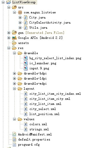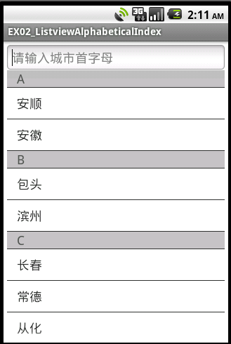 package com.magus.listview;import java.util.ArrayList;public class City {private String cityId;private String cityName;private String cityPinyin;private int cityType;public static final int TYPE_CITY_HOT = 0; // 热门城市public static final int TYPE_CITY_NORMAL = 1;// 普通城市City() {}City(String cityid, String ciryname, String citypinyin, int citytype) {cityId = cityid;cityName = ciryname;cityPinyin = citypinyin;cityType = citytype;}City(String ciryname, String citypinyin, int citytype) {cityId = "";cityName = ciryname;cityPinyin = citypinyin;cityType = citytype;}public String getCityId() {return cityId;}public void setCityId(String cityId) {this.cityId = cityId;}public String getCityName() {return cityName;}public void setCityName(String cityName) {this.cityName = cityName;}public String getCityPinyin() {return cityPinyin;}public void setCityPinyin(String cityPinyin) {this.cityPinyin = cityPinyin;}public int getCityType() {return cityType;}public void setCityType(int cityType) {this.cityType = cityType;}public static ArrayList<City> getCityList() {ArrayList<City> cityList = new ArrayList<City>();// 热门城市City mCity;// AmCity = new City("安顺", "AS", TYPE_CITY_NORMAL);cityList.add(mCity);mCity = new City("安徽", "AH", TYPE_CITY_NORMAL);cityList.add(mCity);// BmCity = new City("包头", "BT", TYPE_CITY_NORMAL);cityList.add(mCity);mCity = new City("滨州", "BZ", TYPE_CITY_NORMAL);cityList.add(mCity);// CmCity = new City("长春", "CC", TYPE_CITY_NORMAL);cityList.add(mCity);mCity = new City("常德", "CD", TYPE_CITY_NORMAL);cityList.add(mCity);mCity = new City("从化", "CH", TYPE_CITY_NORMAL);cityList.add(mCity);mCity = new City("重庆", "CQ", TYPE_CITY_NORMAL);cityList.add(mCity);mCity = new City("常熟", "CS", TYPE_CITY_NORMAL);cityList.add(mCity);mCity = new City("常州", "CZ", TYPE_CITY_NORMAL);cityList.add(mCity);mCity = new City("郴州", "CZ", TYPE_CITY_NORMAL);cityList.add(mCity);// DmCity = new City("丹东", "DD", TYPE_CITY_NORMAL);cityList.add(mCity);mCity = new City("大连", "DL", TYPE_CITY_NORMAL);cityList.add(mCity);mCity = new City("大庆", "DQ", TYPE_CITY_NORMAL);cityList.add(mCity);mCity = new City("德州", "DZ", TYPE_CITY_NORMAL);cityList.add(mCity);return cityList;}}package com.magus.listview;import java.util.ArrayList;import java.util.List;public class Utils {/** * 处理城市列表,加入开头字幕索引 * * @author johnson 安顺 北京 ==加工==> A 安顺 B 北京 * **/public static ArrayList<City> rebuildList(List<City> mList) {String cityPinyin = "";String indexPinyin = "0";final ArrayList<City> buildList = new ArrayList<City>();for (City city : mList) {cityPinyin = city.getCityPinyin().substring(0, 1);if (!cityPinyin.equals(indexPinyin)) {indexPinyin = cityPinyin;buildList.add(addCityIndex(indexPinyin));buildList.add(city);} else {buildList.add(city);}}return buildList;}/** * 开头字幕索引 * * @author johnson */public static City addCityIndex(String str) {return new City("-"+ str, str, City.TYPE_CITY_NORMAL);}}package com.magus.listview;import java.util.ArrayList;import android.app.Activity;import android.content.Context;import android.graphics.PixelFormat;import android.os.Bundle;import android.os.Handler;import android.text.Editable;import android.text.TextWatcher;import android.view.LayoutInflater;import android.view.View;import android.view.ViewGroup;import android.view.WindowManager;import android.view.WindowManager.LayoutParams;import android.widget.AbsListView;import android.widget.AdapterView;import android.widget.BaseAdapter;import android.widget.EditText;import android.widget.ListView;import android.widget.TextView;import android.widget.Toast;/** * * 城市选择 activity * * @author Johnson * */public class CitySelectActivity extends Activity implementsListView.OnScrollListener {// 城市选择private ListView listView;private ArrayList<City> listBasicData = new ArrayList<City>();// 存放原始数据;private ArrayList<City> list = new ArrayList<City>();// 存放临时数据private LayoutInflater mInflater;private RemoveWindow mRemoveWindow = new RemoveWindow();private WindowManager mWindowManager;private TextView mDialogText;private boolean mShowing;private boolean mReady;private String mPrevLetter = "";private EditText filterEdit;Handler mHandler = new Handler();@Overrideprotected void onCreate(Bundle savedInstanceState) {super.onCreate(savedInstanceState); //原始数据listBasicData = City.getCityList();//初始化显示数据加入字幕索引iteminitShowData();this.setContentView(R.layout.city_select);mInflater = (LayoutInflater) getSystemService(Context.LAYOUT_INFLATER_SERVICE);listView = (ListView) findViewById(R.id.list_view);final myAdapter adapter = new myAdapter();listView.setAdapter(adapter);listView.setItemsCanFocus(false);listView.setChoiceMode(ListView.CHOICE_MODE_SINGLE);// 设置单选模型listView.setOnItemClickListener(new AdapterView.OnItemClickListener() {@Overridepublic void onItemClick(AdapterView<?> parent, View view,int position, long id) {Toast.makeText(getApplicationContext(), list.get(position).getCityName(), Toast.LENGTH_SHORT).show();}});filterEdit = (EditText) findViewById(R.id.edit_filter);filterEdit.addTextChangedListener(new TextWatcher() {public void onTextChanged(CharSequence s, int start, int before,int count) {}public void beforeTextChanged(CharSequence s, int start, int count,int after) {}public void afterTextChanged(Editable s) {final String txt = s.toString().toLowerCase();if (list != null) {list.clear();if (listBasicData != null && listBasicData.size() > 0) {for (City mCity : listBasicData) {String pinyin = mCity.getCityPinyin();String name = mCity.getCityName();if (pinyin.startsWith(txt)|| pinyin.startsWith(txt.toLowerCase())|| pinyin.startsWith(txt.toUpperCase())|| (name.indexOf(txt) != -1)) {list.add(mCity);}}if ("".equals(txt)) {//当字母过滤框内容为空重新初始化数据initShowData();}if ("".equals(txt)) {mReady = true;} else {mReady = false;}// List数据变