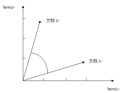 我们先来说下文档(document)和其中包含的词条(term)之间的关系,对于每篇文档它是由词条组成的因此可以表示成一个向量D(term1,term2,......,termn)。我们假设有两篇文档同时出现了term1和term2,那么我们用一个二维坐标系来表示文档和词条之间的关系。如下: