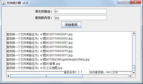 package fileFound;import java.awt.event.ActionEvent;import java.awt.event.ActionListener;import javax.swing.*;/** * 文件的查找登陆界面 *  * @author lenovo *  */public class FileFoundUI extends JFrame{public static void main(String args[]) {// 创建FileCopy对象FileFoundUI fc = new FileFoundUI();fc.showUI();}/** * 初始化窗口 */public void showUI(){//设置标题this.setTitle("文件统计器  v1.0");//设置窗体大小this.setSize(600,350);//创建流式布局器java.awt.FlowLayout fl=new java.awt.FlowLayout();this.setLayout(fl);//创建一个面板对象JPanel jp=new JPanel();//创建一个尺寸对象java.awt.Dimension di=new java.awt.Dimension(392,96);//设置面板的大小jp.setPreferredSize(di);//创建并给面板加上流式布局器java.awt.FlowLayout fl1=new java.awt.FlowLayout();jp.setLayout(fl1);//创建两个标签,创建两个文本框,一个按钮JLabel jl1=new JLabel("源文件路径:");final JTextField jt1=new JTextField(20);JLabel jl2=new JLabel("查找的内容:");final JTextField jt2=new JTextField(20);JButton jb=new JButton("开始查找");//将标签,文本行,按钮加到面板上去jp.add(jl1);jp.add(jt1);jp.add(jl2);jp.add(jt2);jp.add(jb);//把面板加到窗体this.add(jp);//创建一个多行文本框final JTextArea jta=new JTextArea(11,50);this.add(jta);// 创建一个滚动条JScrollPane jsp = new JScrollPane(jta);this.add(jsp);//窗体大小不可改变this.setResizable(false);//关闭时退出this.setDefaultCloseOperation(3);//将窗体显示出来this.setVisible(true);//给开始复制按钮安装动作监听器jb.addActionListener(new ActionListener() {public void actionPerformed(ActionEvent e) {String start="**********************************开始查找************************************\n";//将start写入多行文本框中jta.append(start);//得到源文件路径String str1=jt1.getText();//得到查找的内容String str2=jt2.getText();//创建一个FileFound对象FileFound ff=new FileFound();int count=ff.foundfile(str1, str2);//得到迭代器java.util.Iterator<String> ite=ff.getlist().iterator();while(ite.hasNext()){jta.append(ite.next()+"\n");}jta.append("                             查找完毕!!!    总共查找到:"+count+"个文件");