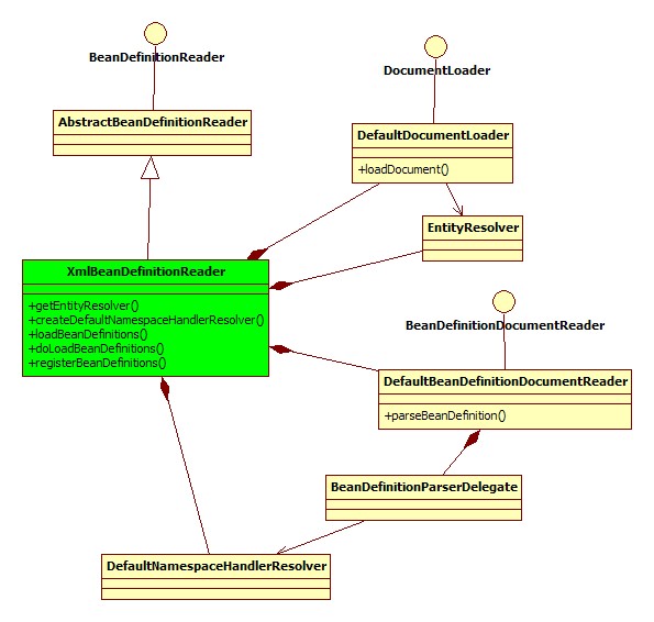 public class PluggableSchemaResolver implements EntityResolver { /***定义schema location的映射文件路径***/ public static final String DEFAULT_SCHEMA_MAPPINGS_LOCATION = "META-INF/spring.schemas"; private static final Log logger = LogFactory.getLog(PluggableSchemaResolver.class); private final ClassLoader classLoader; private final String schemaMappingsLocation; /** Stores the mapping of schema URL -> local schema path */ private Properties schemaMappings; public PluggableSchemaResolver(ClassLoader classLoader) { this.classLoader = classLoader; this.schemaMappingsLocation = DEFAULT_SCHEMA_MAPPINGS_LOCATION; } public PluggableSchemaResolver(ClassLoader classLoader, String schemaMappingsLocation) { Assert.hasText(schemaMappingsLocation, "'schemaMappingsLocation' must not be empty"); this.classLoader = classLoader; this.schemaMappingsLocation = schemaMappingsLocation; } /**==========中间省略部分代码=========**/ /***此处完成schema的加载***/ protected String getSchemaMapping(String systemId) { if (this.schemaMappings == null) { if (logger.isDebugEnabled()) { logger.debug("Loading schema mappings from [" + this.schemaMappingsLocation + "]"); } try { this.schemaMappings = PropertiesLoaderUtils.loadAllProperties(this.schemaMappingsLocation, this.classLoader); if (logger.isDebugEnabled()) { logger.debug("Loaded schema mappings: " + this.schemaMappings); } } catch (IOException ex) { throw new FatalBeanException( "Unable to load schema mappings from location [" + this.schemaMappingsLocation + "]", ex); } } return this.schemaMappings.getProperty(systemId); } } public class DefaultNamespaceHandlerResolver implements NamespaceHandlerResolver { /** * The location to look for the mapping files. Can be present in multiple JAR files. */ public static final String DEFAULT_HANDLER_MAPPINGS_LOCATION = "META-INF/spring.handlers"; /** Logger available to subclasses */ protected final Log logger = LogFactory.getLog(getClass()); /** ClassLoader to use for NamespaceHandler classes */ private final ClassLoader classLoader; /** Resource location to search for */ private final String handlerMappingsLocation; /** Stores the mappings from namespace URI to NamespaceHandler class name / instance */ private Map handlerMappings; public DefaultNamespaceHandlerResolver() { this(null, DEFAULT_HANDLER_MAPPINGS_LOCATION); } public DefaultNamespaceHandlerResolver(ClassLoader classLoader) { this(classLoader, DEFAULT_HANDLER_MAPPINGS_LOCATION); } public DefaultNamespaceHandlerResolver(ClassLoader classLoader, String handlerMappingsLocation) { Assert.notNull(handlerMappingsLocation, "Handler mappings location must not be null"); this.classLoader = (classLoader != null ? classLoader : ClassUtils.getDefaultClassLoader()); this.handlerMappingsLocation = handlerMappingsLocation; } /**==========中间省略部分代码=========**/ /************************ * Load the specified NamespaceHandler mappings lazily. * 此处加载延迟加载spring.handlers,只有第一次自定义标签被解析到,才会被加载。 ****************************/ private Map getHandlerMappings() { if (this.handlerMappings == null) { try { Properties mappings = PropertiesLoaderUtils.loadAllProperties(this.handlerMappingsLocation, this.classLoader); if (logger.isDebugEnabled()) { logger.debug("Loaded mappings [" + mappings + "]"); } this.handlerMappings = new HashMap(mappings); } catch (IOException ex) { IllegalStateException ise = new IllegalStateException( "Unable to load NamespaceHandler mappings from location [" + this.handlerMappingsLocation + "]"); ise.initCause(ex); throw ise; } } return this.handlerMappings; } } protected int doLoadBeanDefinitions(InputSource inputSource, Resource resource) throws BeanDefinitionStoreException { try { int validationMode = getValidationModeForResource(resource); Document doc = this.documentLoader.loadDocument( inputSource, getEntityResolver(), this.errorHandler, validationMode, isNamespaceAware()); return registerBeanDefinitions(doc, resource); } catch (BeanDefinitionStoreException ex) { throw ex; } catch (SAXParseException ex) { throw new XmlBeanDefinitionStoreException(resource.getDescription(), "Line " + ex.getLineNumber() + " in XML document from " + resource + " is invalid", ex); } catch (SAXException ex) { throw new XmlBeanDefinitionStoreException(resource.getDescription(), "XML document from " + resource + " is invalid", ex); } catch (ParserConfigurationException ex) { throw new BeanDefinitionStoreException(resource.getDescription(), "Parser configuration exception parsing XML from " + resource, ex); } catch (IOException ex) { throw new BeanDefinitionStoreException(resource.getDescription(), "IOException parsing XML document from " + resource, ex); } catch (Throwable ex) { throw new BeanDefinitionStoreException(resource.getDescription(), "Unexpected exception parsing XML document from " + resource, ex); } } getEntityResolver()