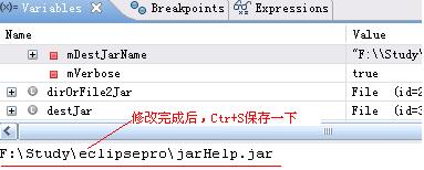在Debug 视图的 Variables 小窗口中,我们可以看到 mDestJarName 变量的值为 " F:\Study\eclipsepro\JarDir\jarHelp.jar "