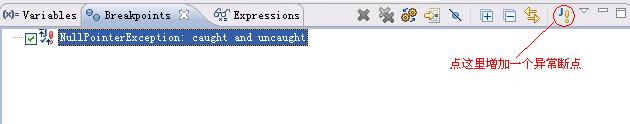 上图中我们增加了一个NullPointException的异常断点,当异常发生时,代码会停在异常发生处,定位问题时应该比较有帮助。