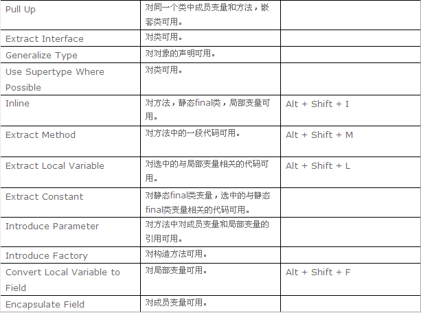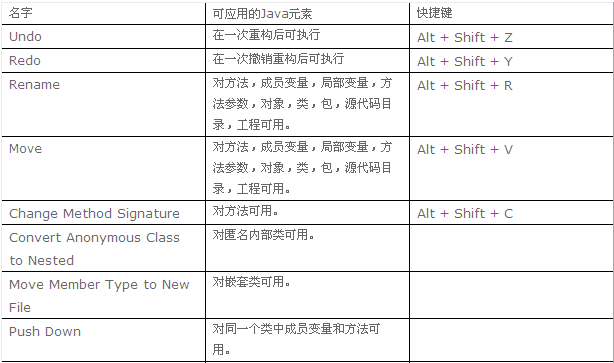 下表从Eclipse帮助中提取,列出了各种重构支持的Java资源类型,对应的快捷键。