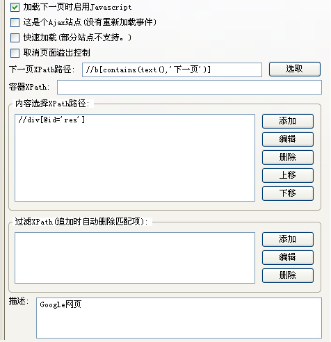 9、这里下面还有3个标签页,第一个就是“站点列表”,先不用管。第二个是“下一页XPath路径”的代码的候选表达式和预览,双击候选框里的表达式即可应用,如果现在不是//b[contains(text(),'下一页')],那么双击应用它。第三个标签页类似,选择//div[@id='res'],为什么要选择这两个呢?等下再说明。