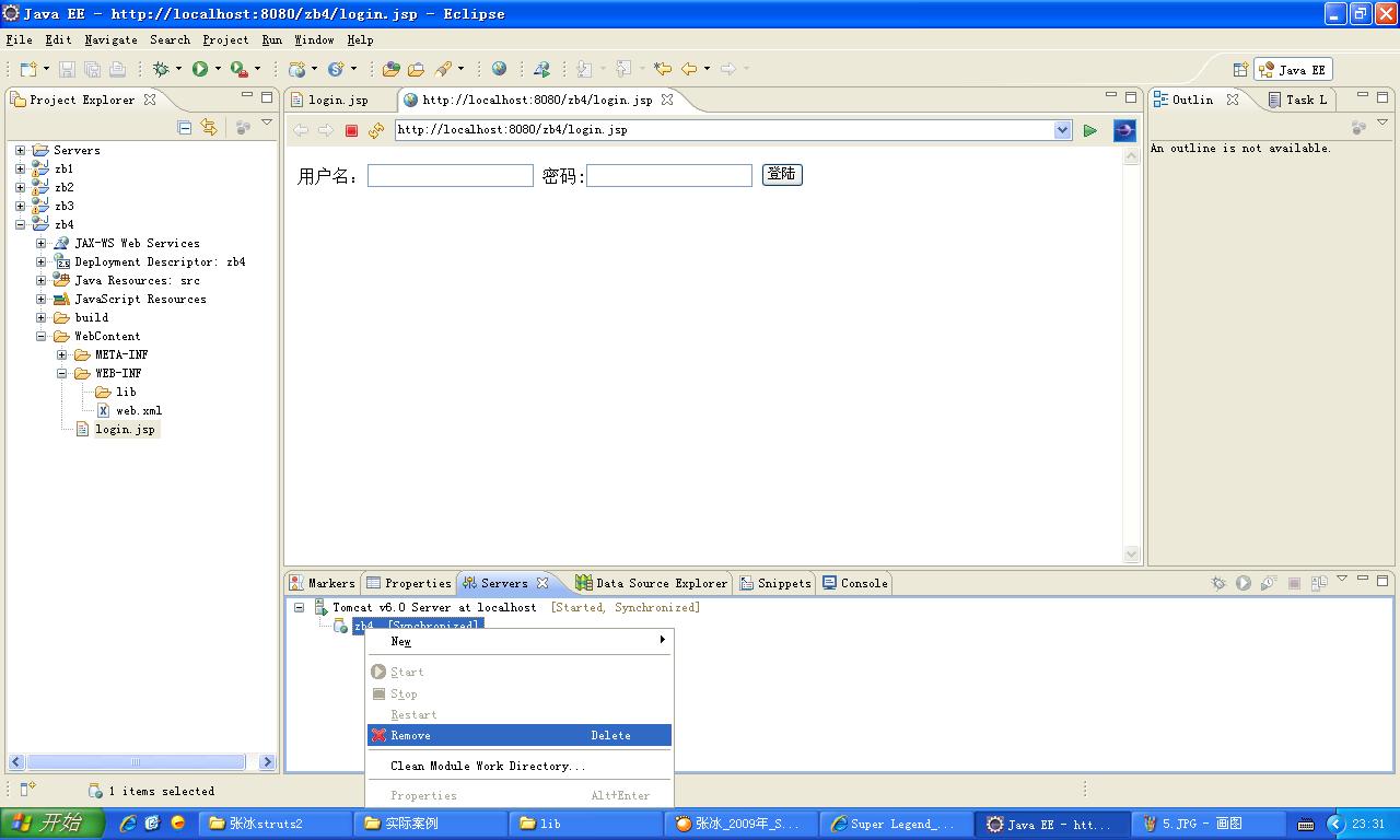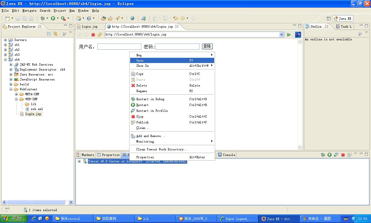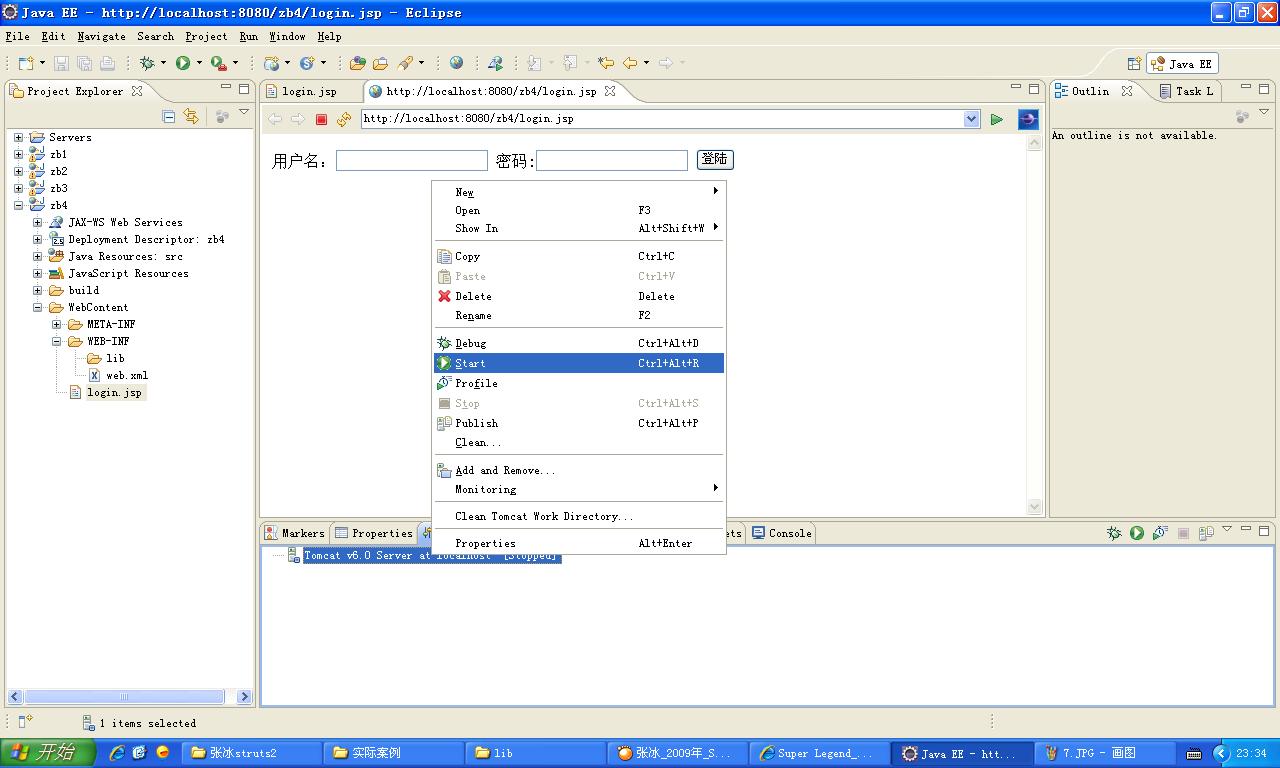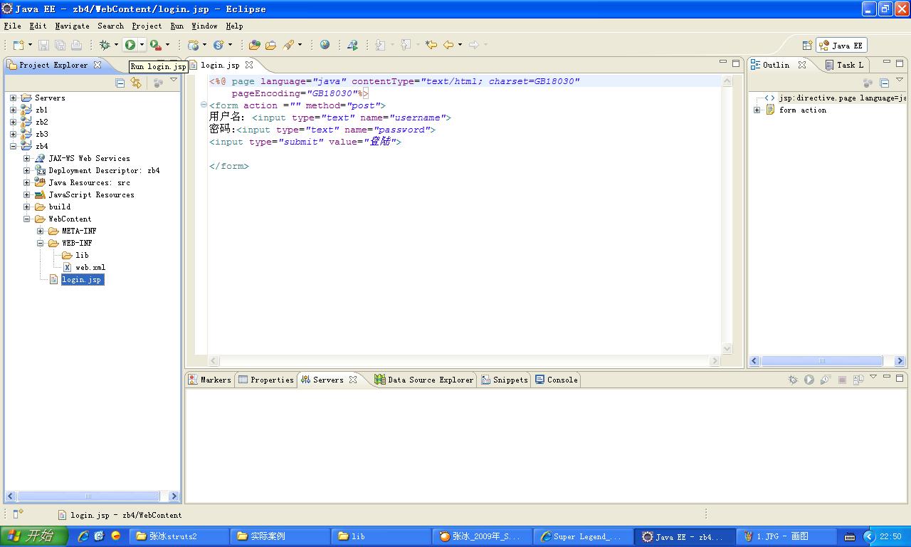 新建个Dynamic Web Project,命名为zb4,在WebContent下,新建个文件login.jsp,随便写段代码,比如我的