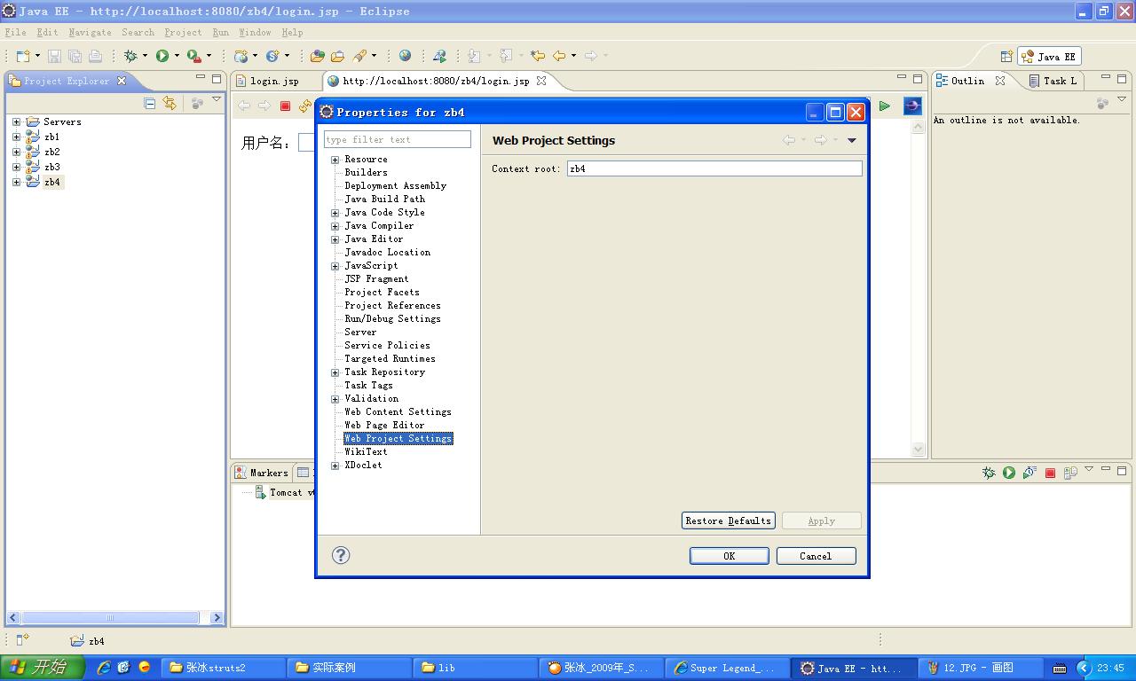 至此,设置完成,以后复制一个项目,只需在项目zb4,右键,选择Properties,再选择Web Project Settings修改下项目名称就可以自动部署到Tomcat的Webapps目录下了。见图12。