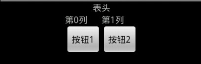<TableLayout xmlns:android="http://schemas.android.com/apk/res/android" android:layout_width="fill_parent" android:layout_height="fill_parent" ><TextView android:layout_width="fill_parent" android:layout_height="wrap_content" android:gravity="center" android:text="表头"/><TableRowandroid:gravity="center"><TextViewandroid:layout_width="wrap_content"android:layout_height="wrap_content"android:text="第0列" --android:layout_marginLeft="10dip"></TextView><TextViewandroid:layout_width="wrap_content"android:layout_height="wrap_content"android:text="第1列"></TextView></TableRow><TableRowandroid:gravity="center"><Buttonandroid:layout_width="wrap_content"android:layout_height="wrap_content"android:text="按钮1"/><Buttonandroid:layout_width="wrap_content"android:layout_height="wrap_content"android:text="按钮2"/></TableRow></TableLayout>